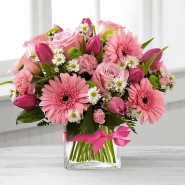 proudly presents the Better Homes and Gardens® Blooming Vision™ Bouquet. Offer them a bouquet blooming with a fresh from the garden appeal. Pink roses, hot pink tulips, pink mini carnations and pink gerbera daisies are accented with white Monte Casino asters and lush greens. Gorgeously arranged in a clear glass cube vase accented with a pink satin ribbon, this bouquet is a soft and graceful way to send your warmest sentiments.
